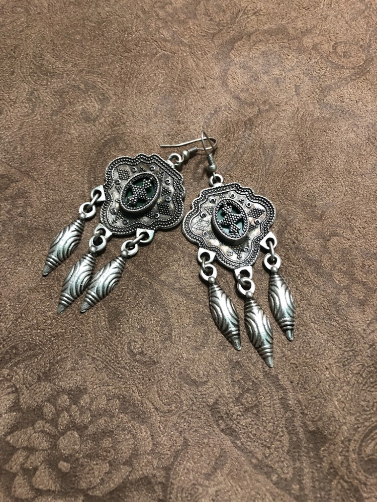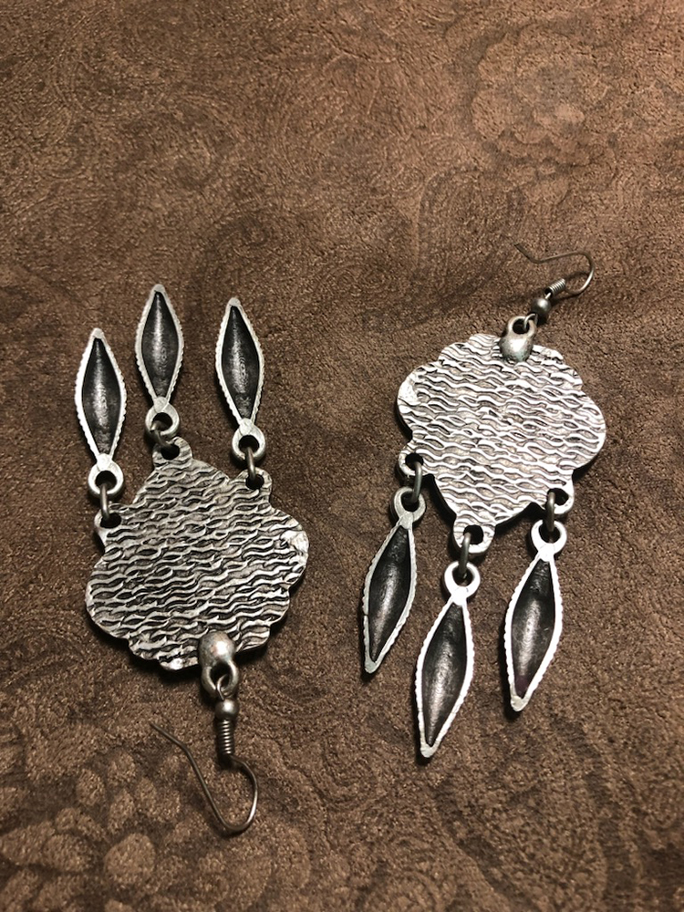 Lovely Kazakh style earrings with low silver and glass. Very lightweight, sweet and playful.